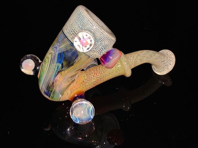 This 1off is 5" overall. Adam did his silver and gold fuming throughout with folds and rakes. Features 5 heady marbles and changes color when used. Signed.