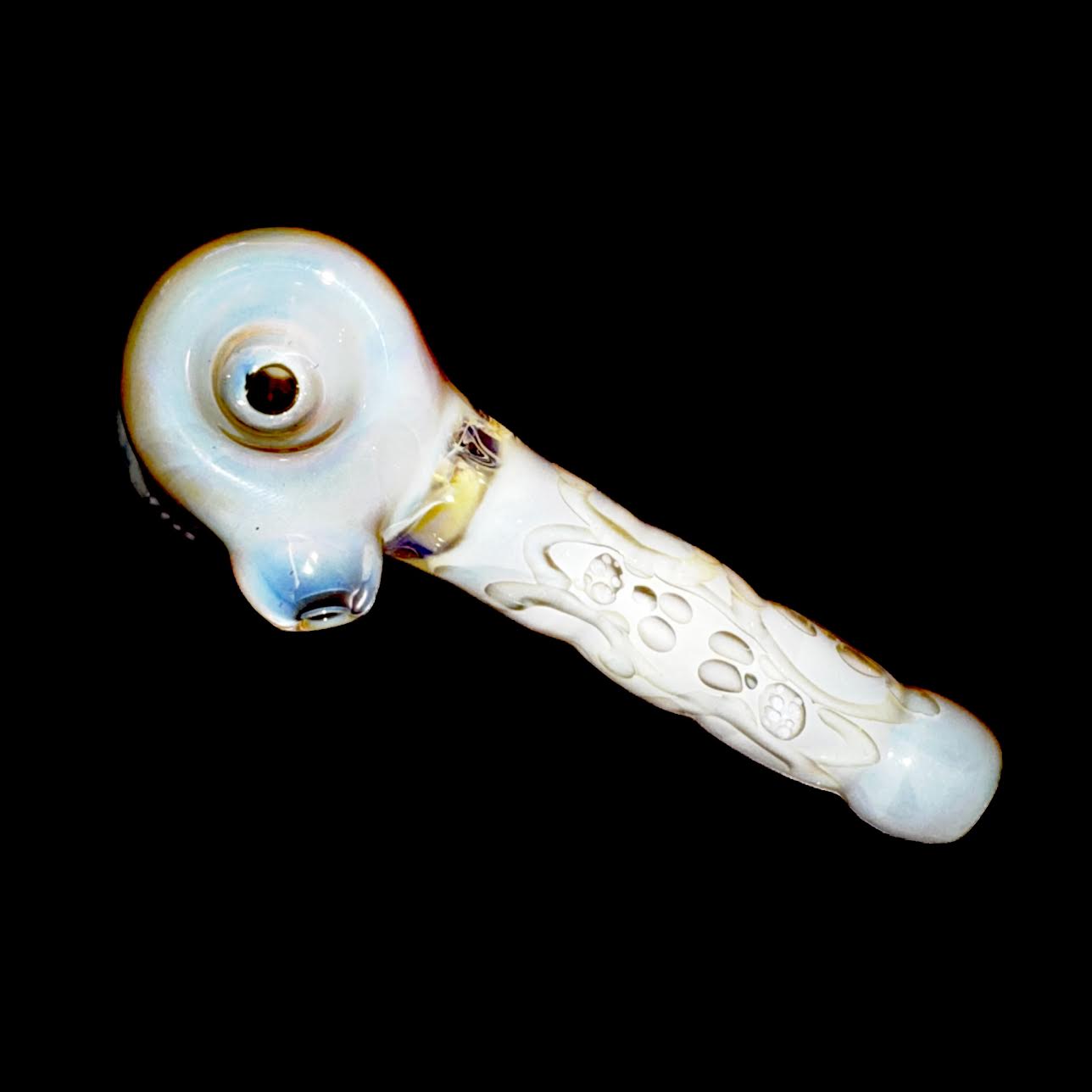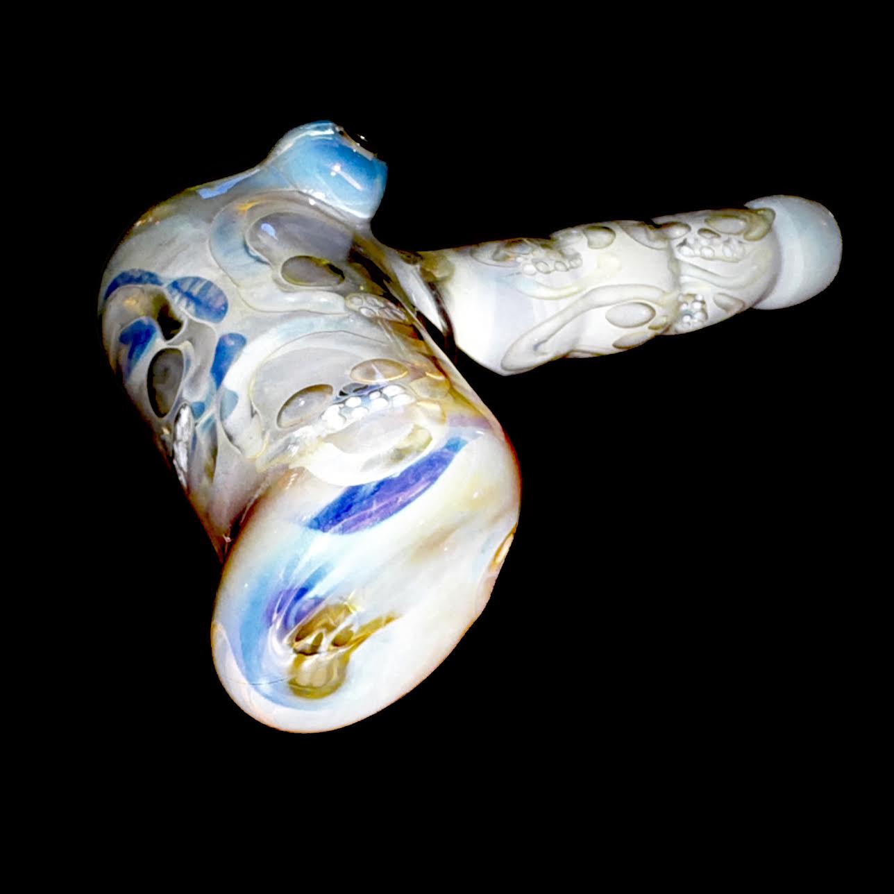 This 1off is 5" overall. BBad drew his fumed skulls with homemade silver white teeth throughout. Changes color when used. SFG