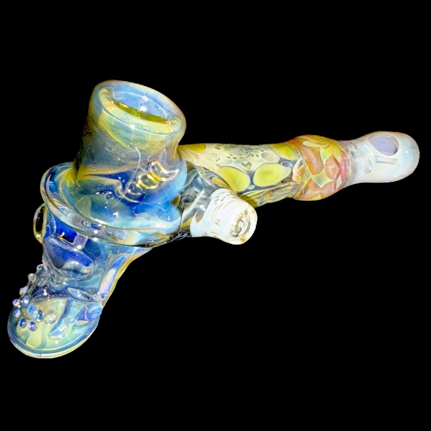 This 1off is 5.5" overall. Bob did his work on the can, Ginny as well as Jon did silver and gold sections on the stem with a Bob skull with Aliens mouthpiece. UV active and changes color when used. Signed. SFG
