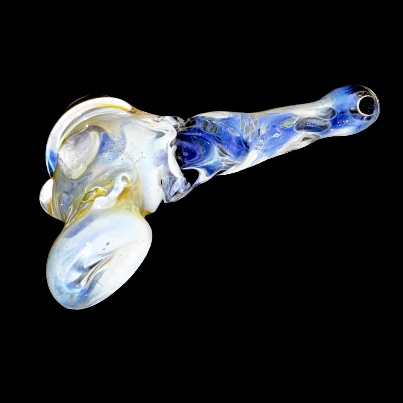 This 1off is 5.5” overall. Bob did his fuming throughout with skulls on the stem. Changes color when used. Signed. SFG!