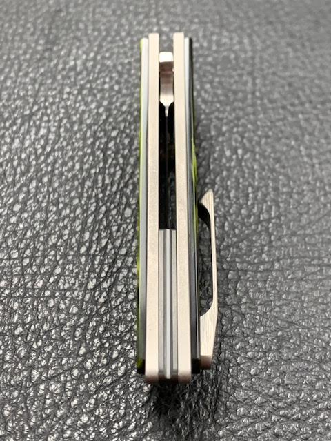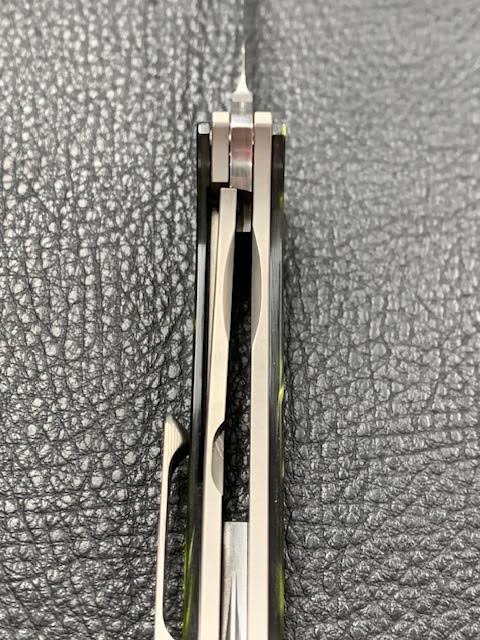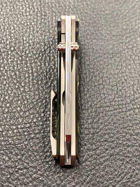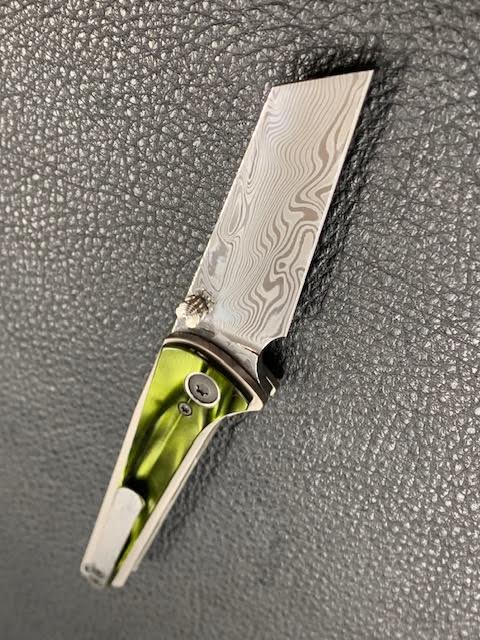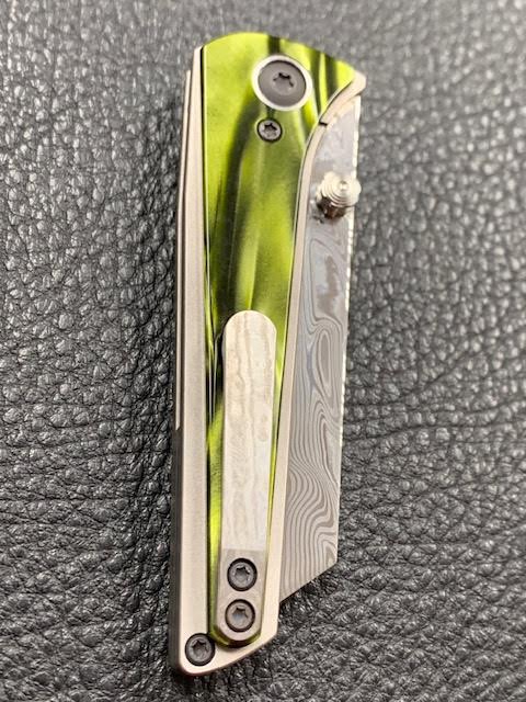 This 1off has a 2.9" polished Damasteel blade that is 6.75" overall The titanium frame lock has Kirinite Venom Pearl scales with titanium hardware. Fire on ceramic bearings and detent like butter. Features a 3D timascus back spacer and Zirc back spacer. New form CCKS.