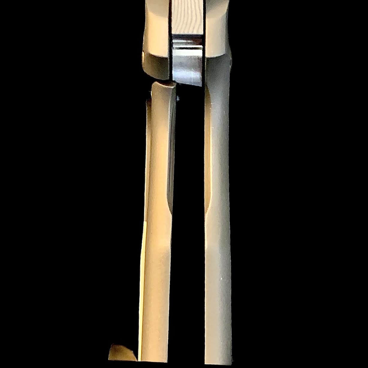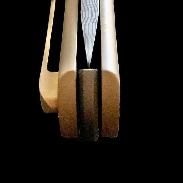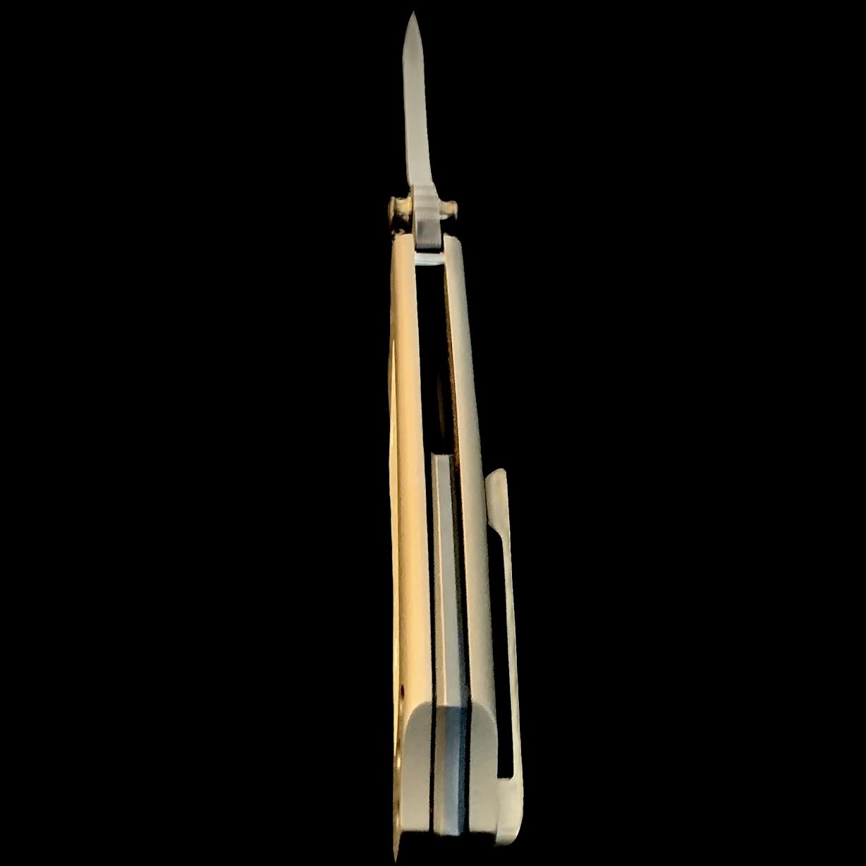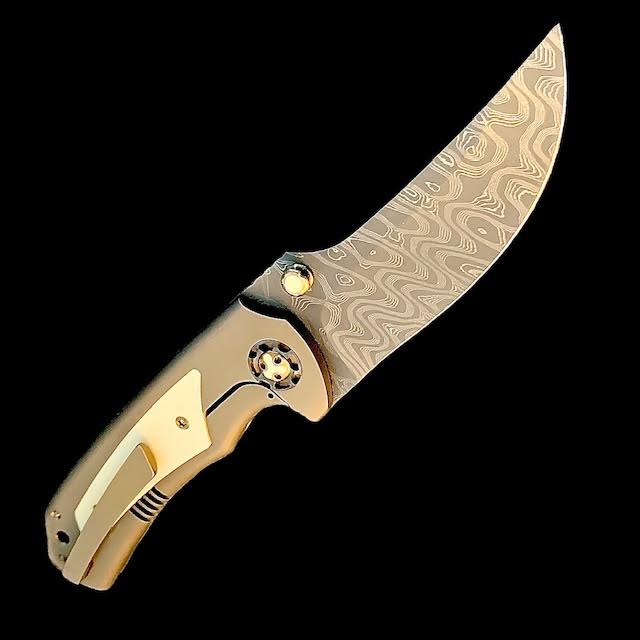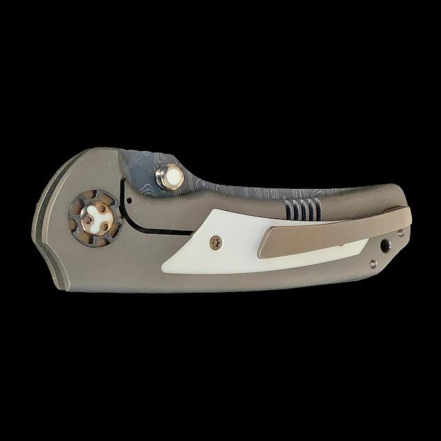 This off has a 3.25" Nichols blackout Damascus Persian blade with custom Westinghouse and titanium thumb studs. The contoured bolster lock has double Westinghouse inlays on both sides with a bronze finish. Features a Zirc and Westinghouse custom pivots with a floating Zirc back spacer. Fires on ceramic bearings and detent with titanium hardware. Gorgeous Persian!