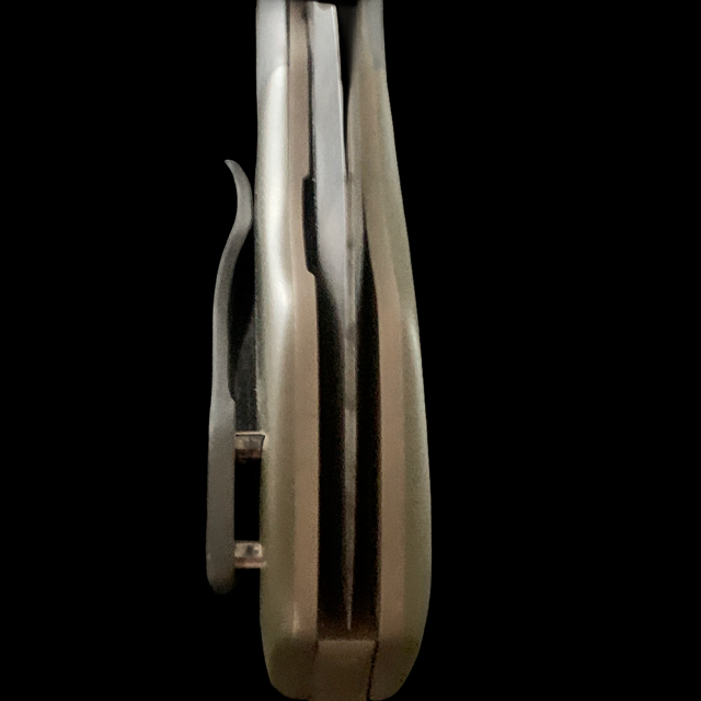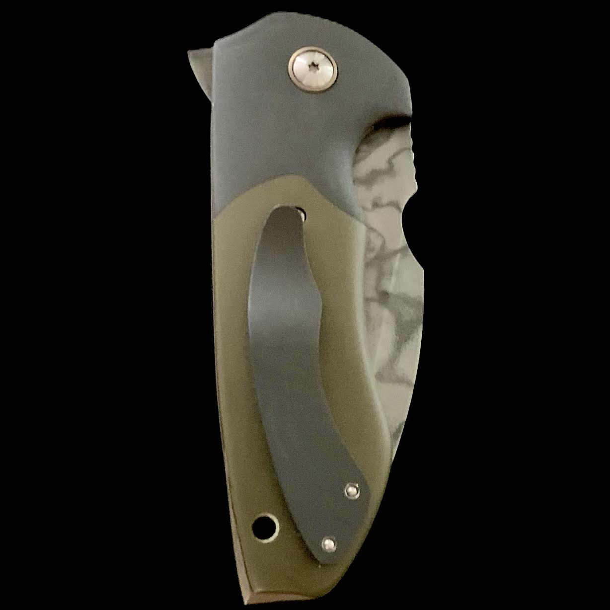 This 1off has a 3.25" 1095 Hamon blade that is 7.5" overall. The titanium liner lock has a bronze finish with dark titanium bolsters, green g10 handles with Westinghouse Army star. Fires on bearings, has early lock up, a 3D titanium back spacer and dark titanium clip. Rare! It has a few light snail trails from handling. Excellent condition!
