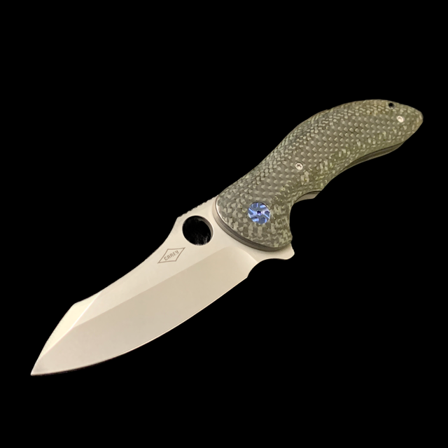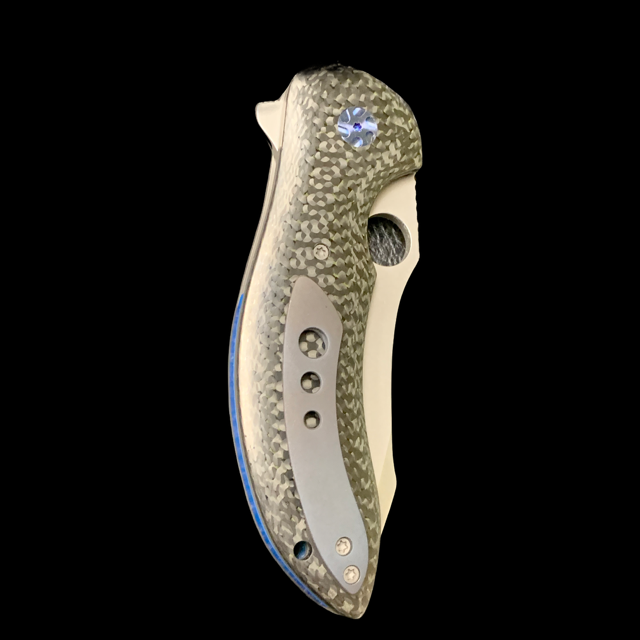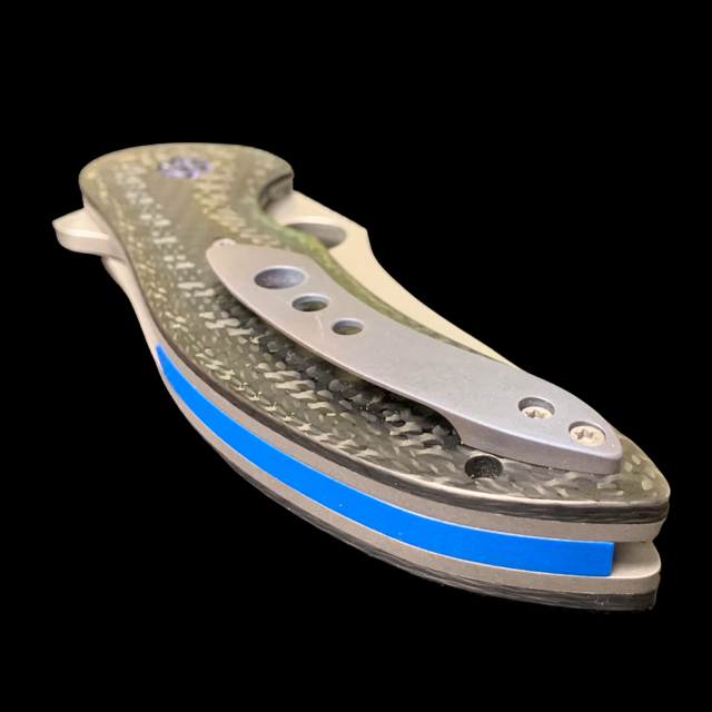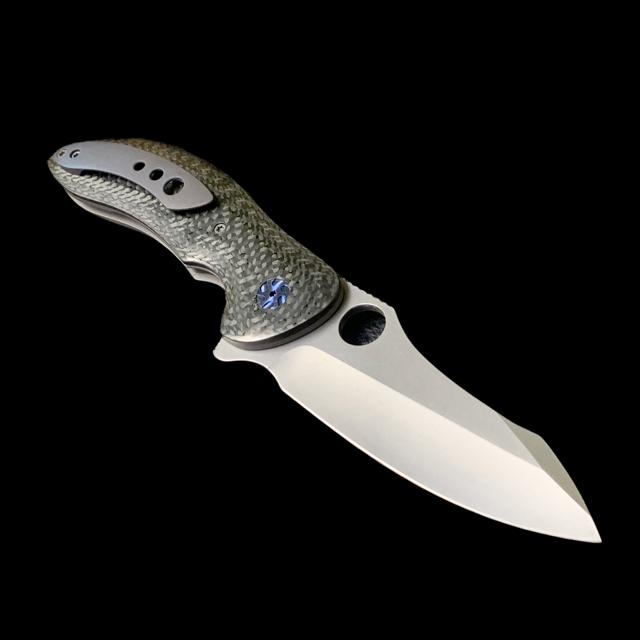 This 1off has a 3.5" blasted CPM154 blade that is 8.25" overall. The titanium liner lock has contoured carbon fiber scales with titanium hardware and pivot. Fires hard on ceramic bearings and detent with a blue g10 back spacer as well as a 3D titanium clip. Excellent condition!