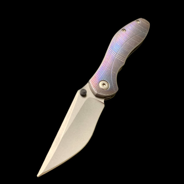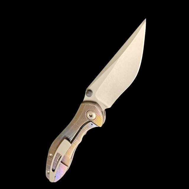 This Crusade has a 3.25" hand ground Magnacut blade that is 7.5" overall. The titanium frame lock has a line pattern and is milled out on the inside, comes with titanium hardware. It fires on ceramic bearings, has a titanium 3D clip and back spacer.