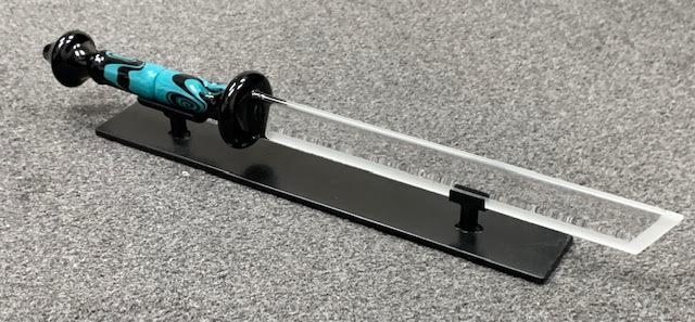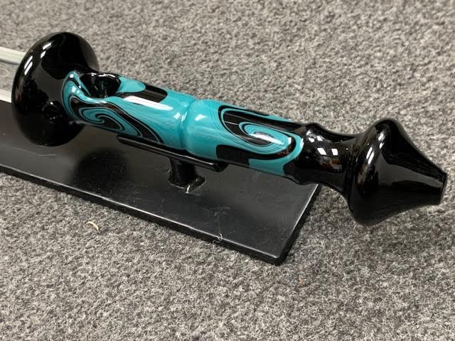 This 1off is 22" overall. Darby did his linework on the handle that is also a pipe. Comes with a solid metal stand. Never used.