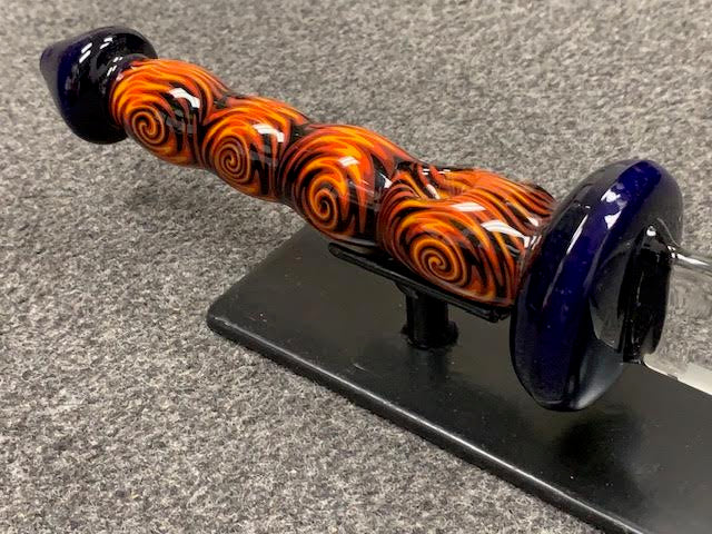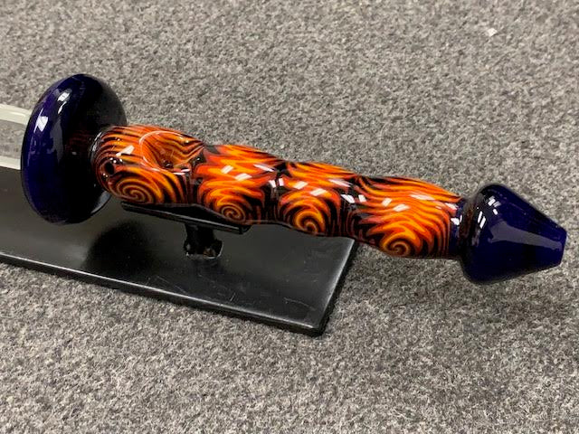 This 1off is 26" overall. Darby did his linework on the handle that is also a pipe. Comes with a solid metal stand. Never used.