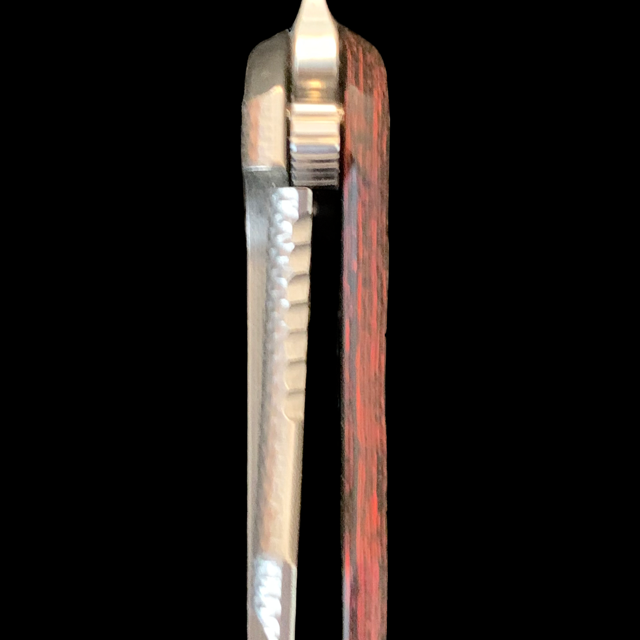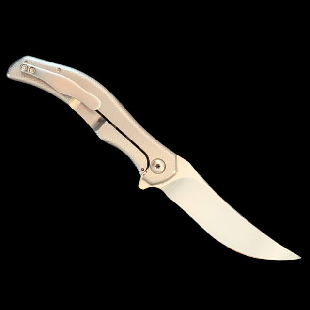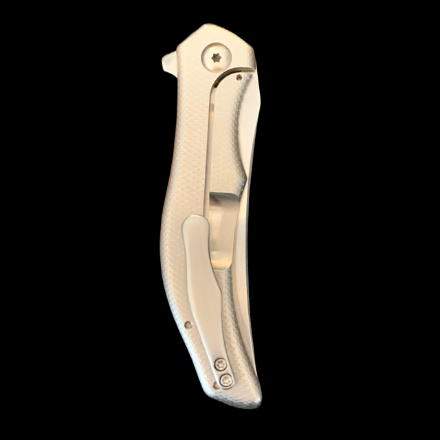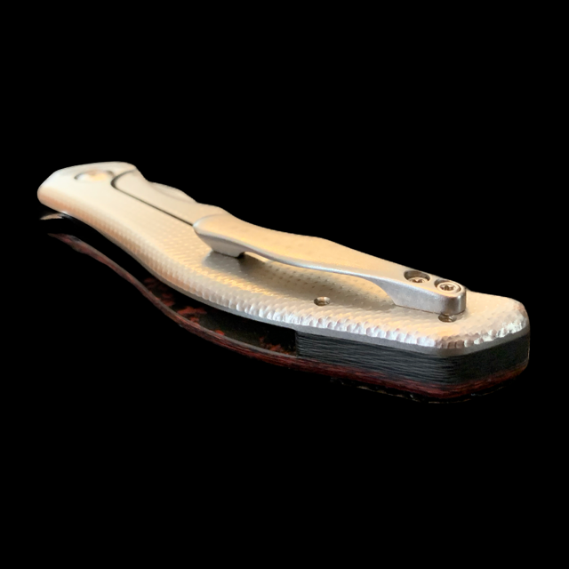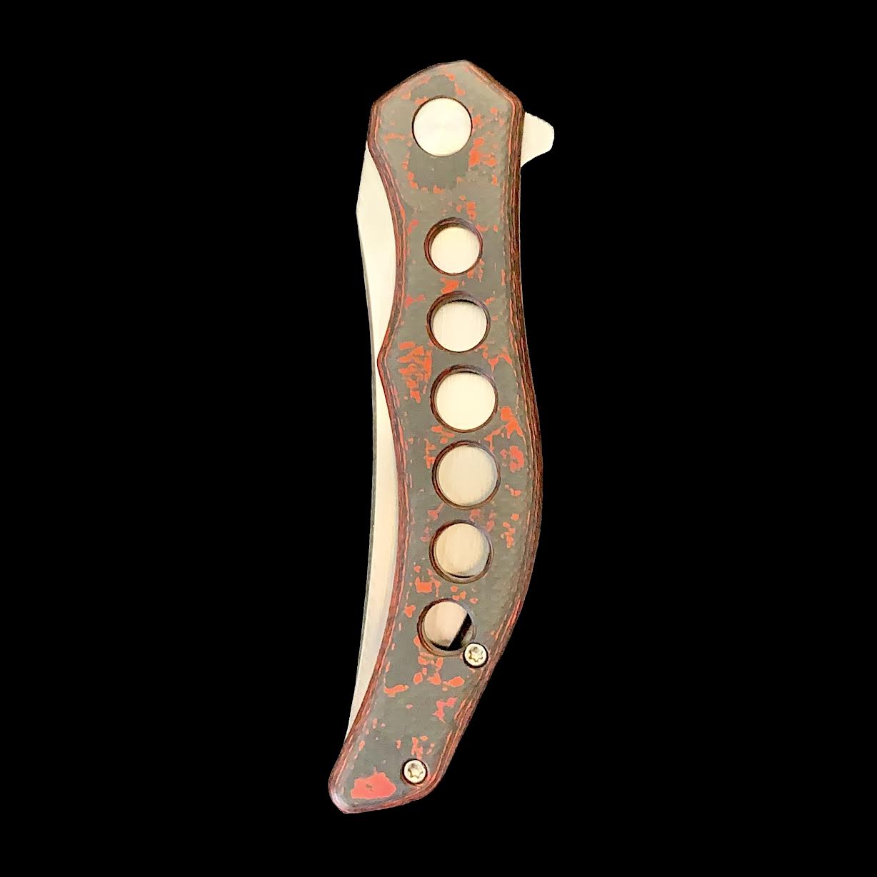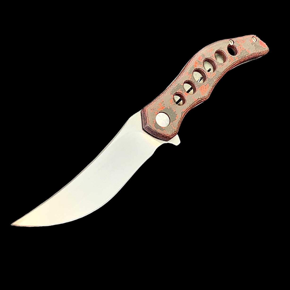 This 1off has a 2.75" hand rub 154V centered blade that is 7" overall. The textured titanium frame lock has a textured camo carbon fiber scale with speed holes. Deploys on washers, has a carbon fiber back spacer and 3D titanium clip. It has a few marks on the blade but other then that excellent condition.