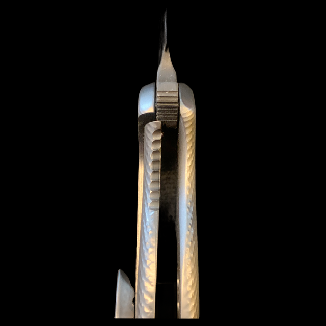 This 1off has a 3.25" Blackout Raindrop Damascus centered blade that is 7.5" overall. The textured titanium frame lock has MOA holes on the show scale and a 3D titanium clip. Deploys on washers and a has a full Zirc back spacer. Excellent condition.