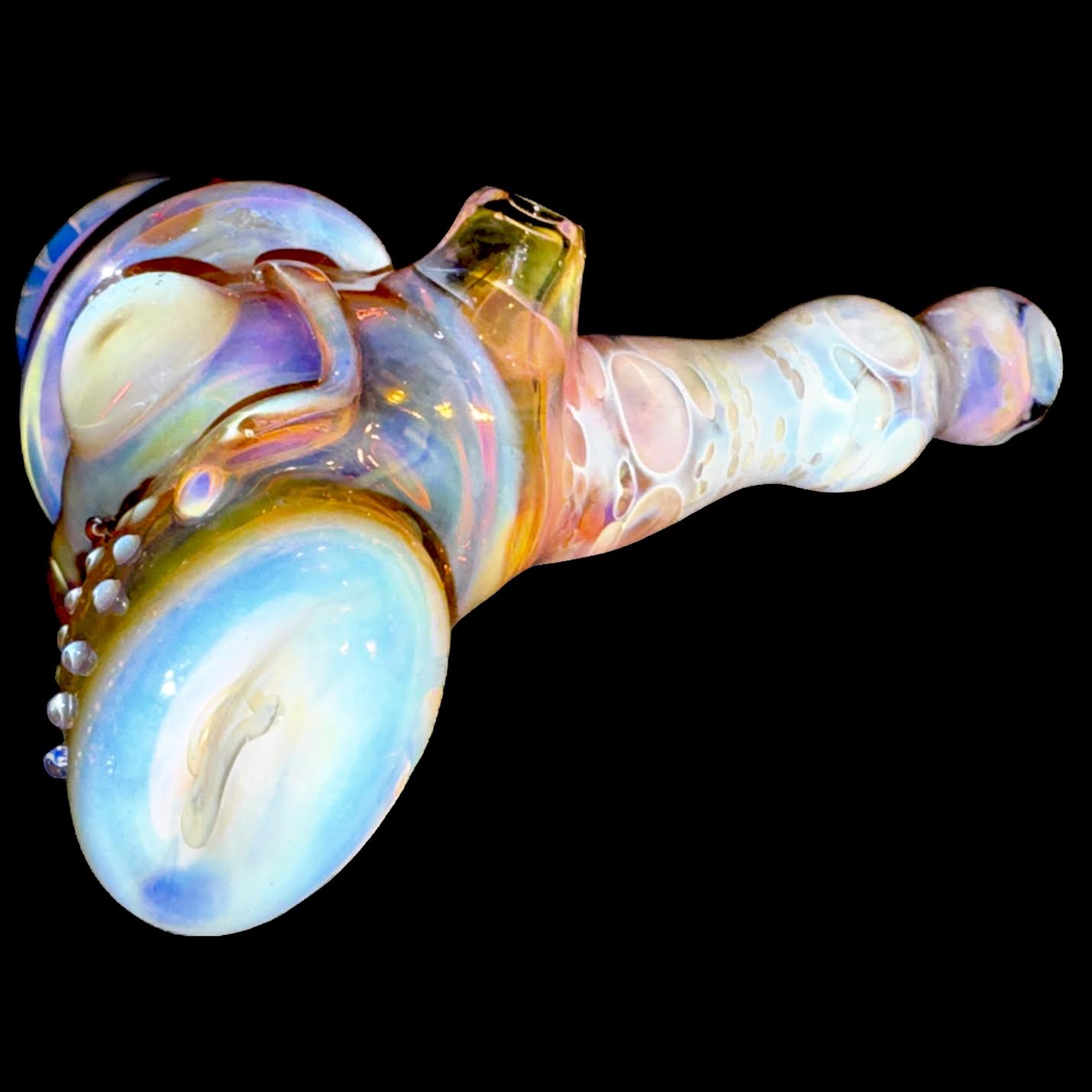 This 1off is 5" overall. Ginny did her silver and gold on the can and Jon did his fume skulls and the stem. Changes color when used. Signed. SFG!