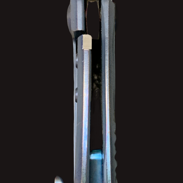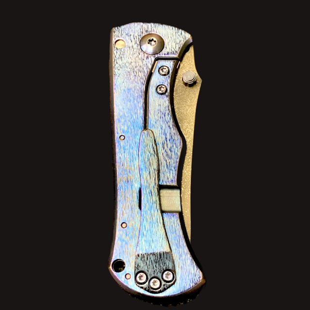 This 1off has a 3.25" spot coated Magnacut blade that is 7.4" overall. The titanium frame lock has an amazing machined show scale with a double blue ano and bark finished. It deploys on ceramic bearings and detent with a 3d titanium clip. Features a titanium rock pattern back spacer and titanium studs.