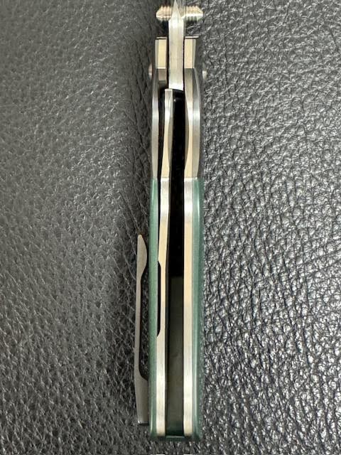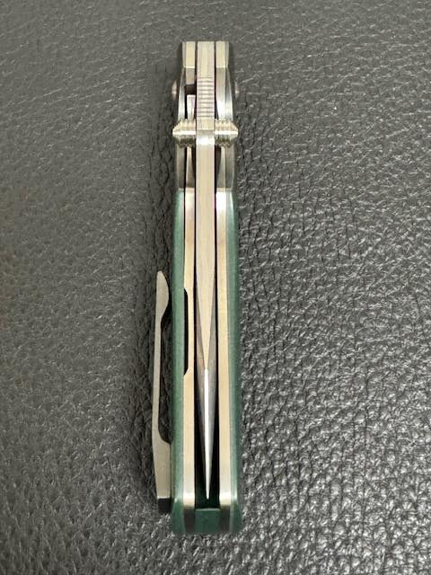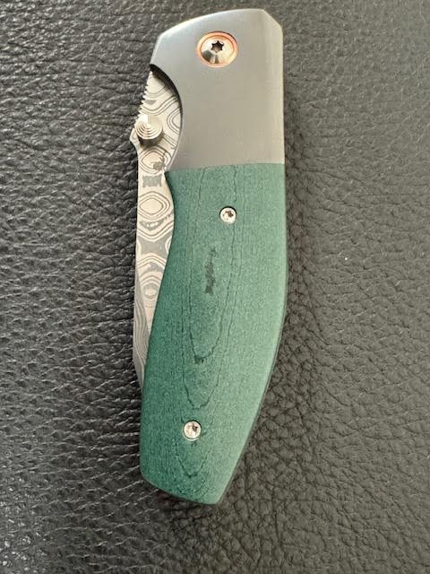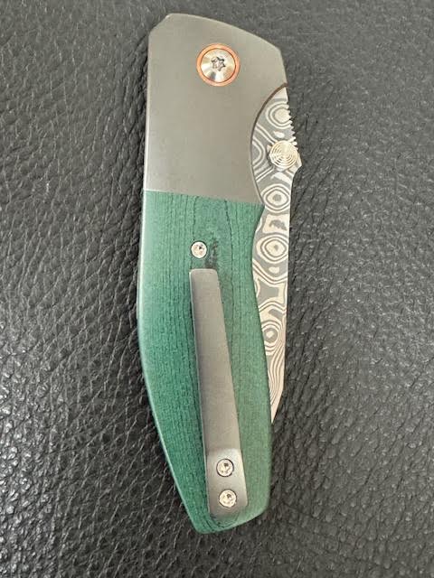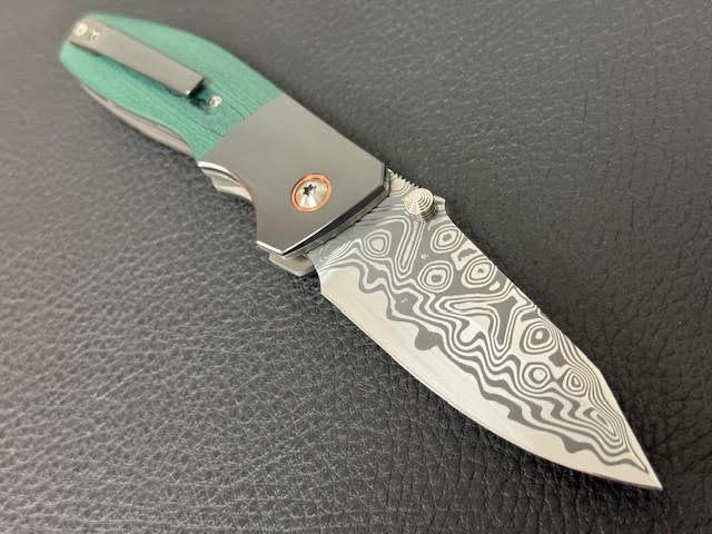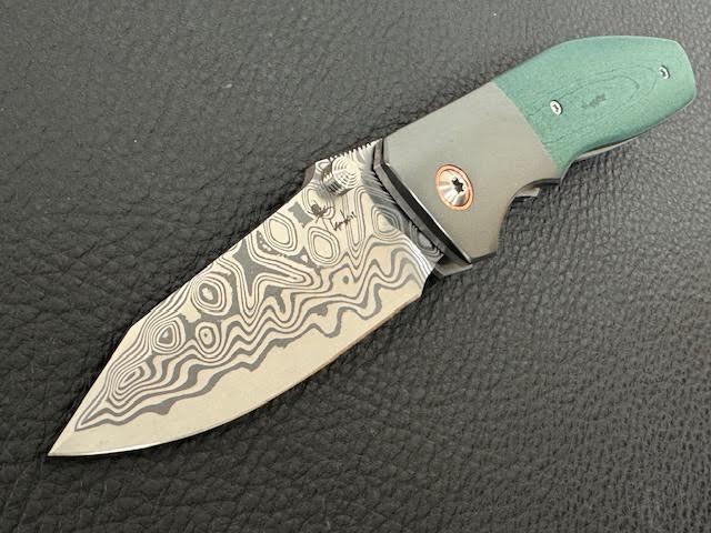 This 1off has a 3.25" San Mai blade that is 7.5" overall. The titanium liner lock has Zirc bolsters with emerald green Westinghouse micarta scales with titanium hardware. Features a titanium pivot with copper collars, Zirc 3D clip and emerald green micarta back spacer. New
