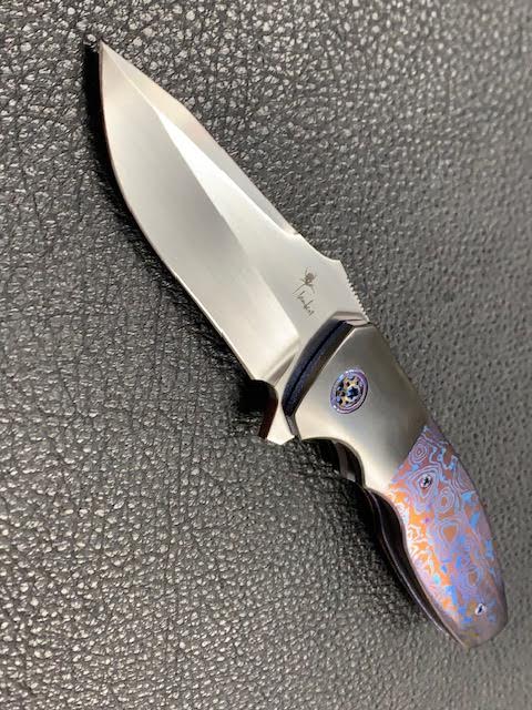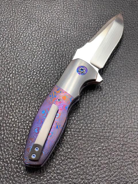 This 1off has a 3.5" hand rub satin Nitro-V blade that is 7.75" overall. The blue textured liner lock has Zirc bolsters and Mokuti scales with titanium hardware to match. Fires on bearings, has a floating Mokuti back spacer and a 3D Zirc clip. New