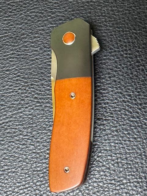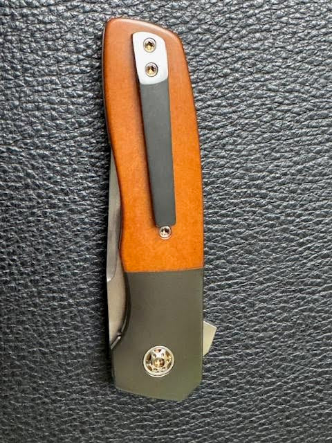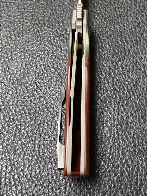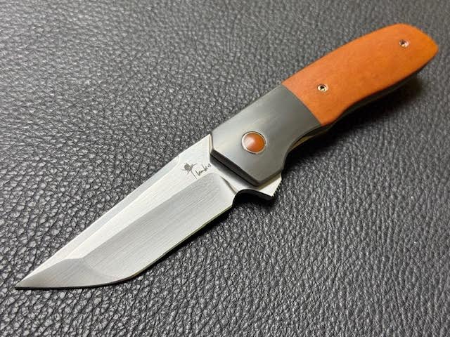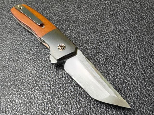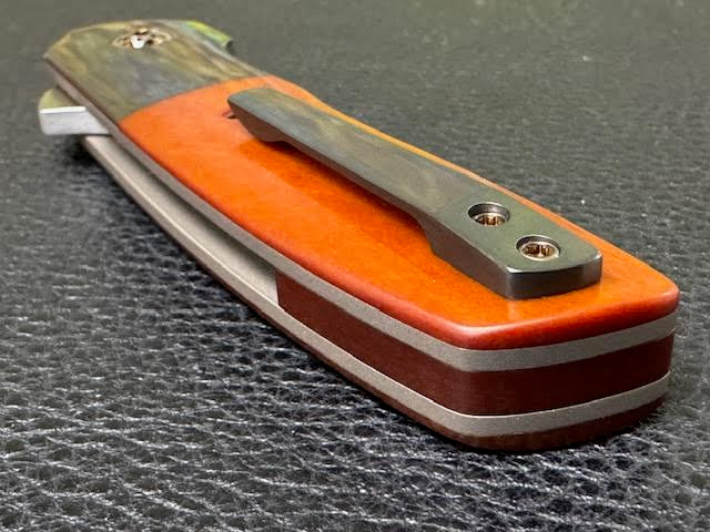 This 1off has a 3.25" hand rubbed Nitro-V blade that is 8" overall. The titanium liner lock has Zirc bolsters with vintage micarta scales and back spacer. Fires on Skiff bearings, has a custom pivot with titanium hardware and a 3D Zirc clip.