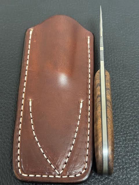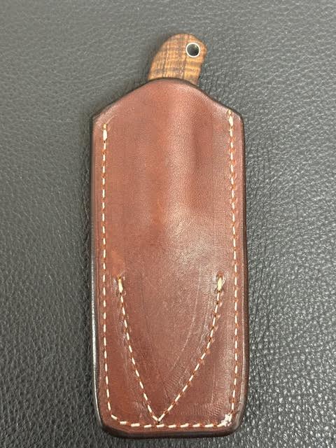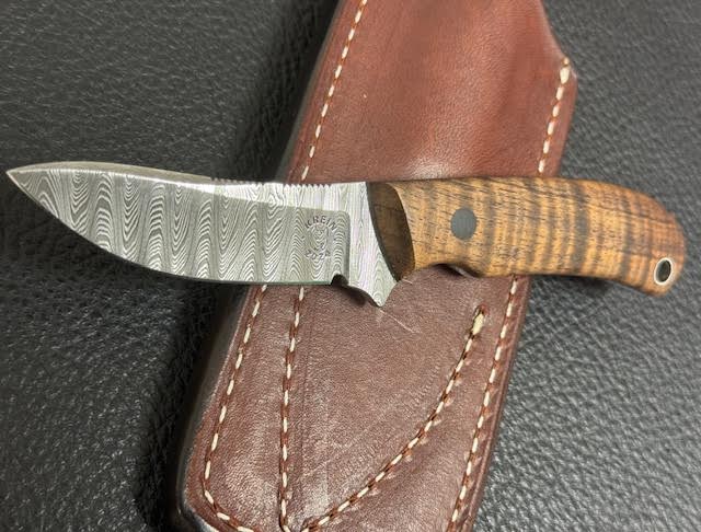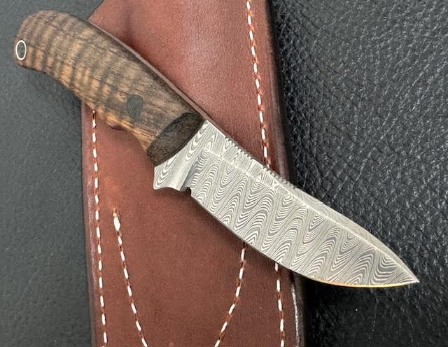 This 1off has a 3" SS Damascus blade that is 6.25" overall. Features a Koa handle with black liners and a leather sheath. New from Tom