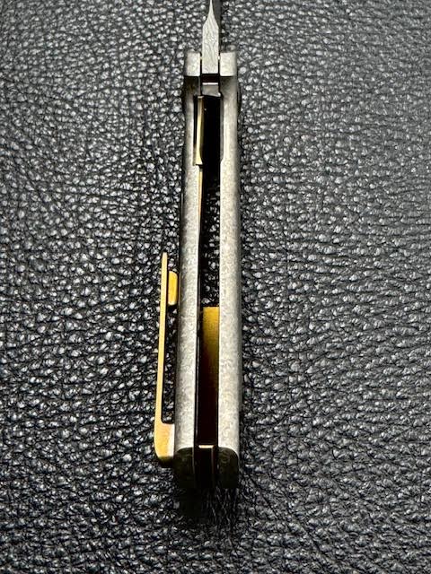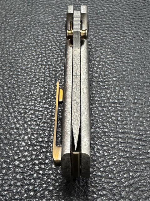 This 1off grail has a 3” Norris Damascus blade that is 7” overall. The crystalized titanium inset lock has black Timascus Zirc inlays on both sides with custom Zirc screws and pivot. Features a bronzed titanium back spacer and 3D clip with inlays. Fires on ceramic bearings. Like New