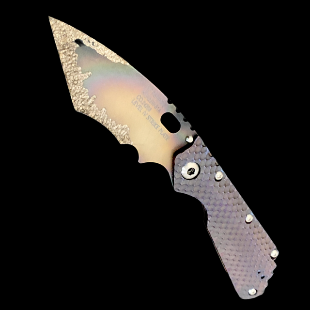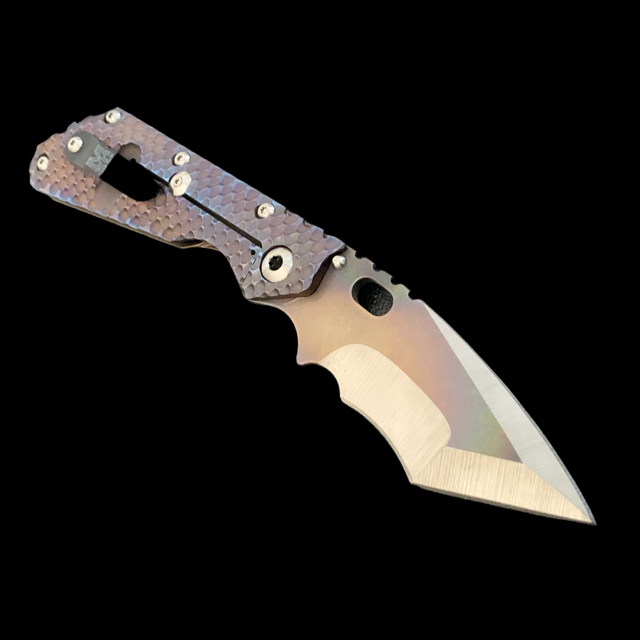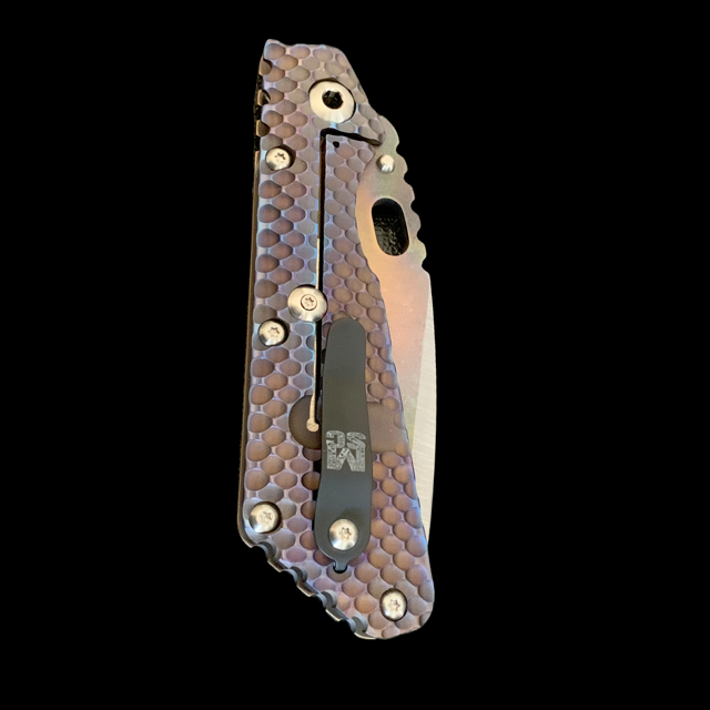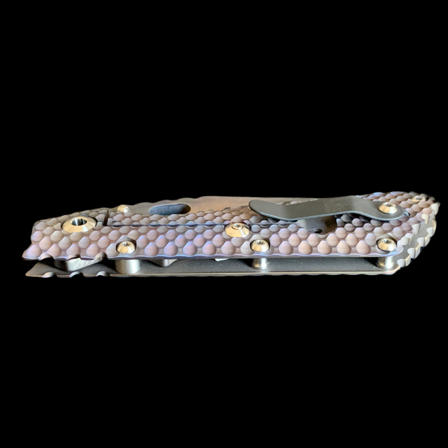 This 1off has an over 4" Strikeplate titanium blade that is 9.75" overall. The double gunner grip titanium frame lock has a purple finish with a black clip. Deploys on washers and titanium stand offs.