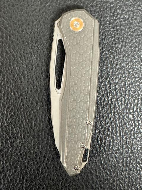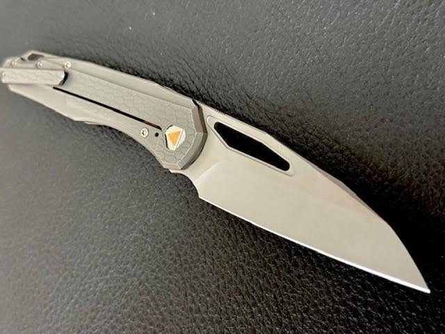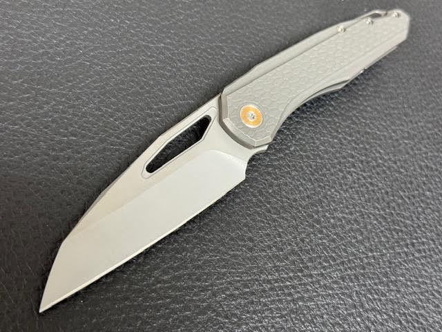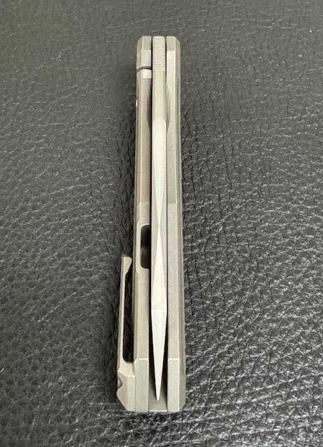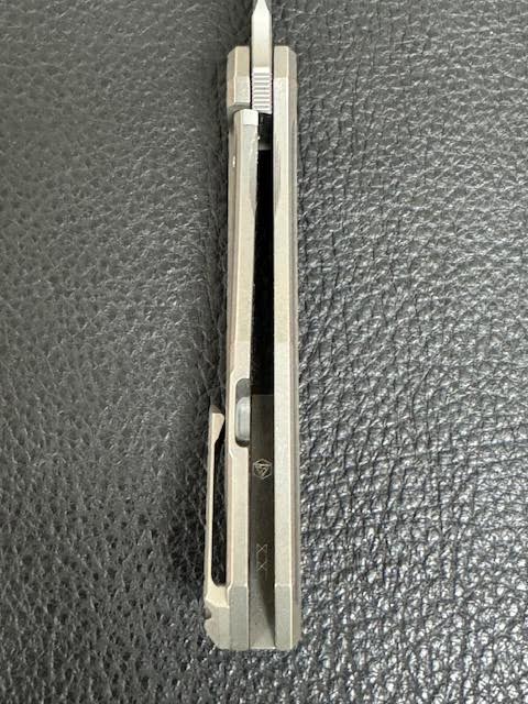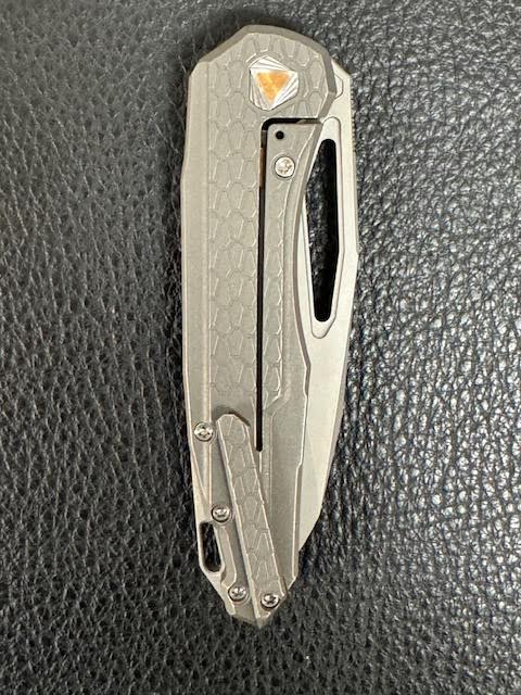 This Sigil has just under 3.5" blasted S90V blade that is 8" overall. The titanium frame lock has coffin milling throughout with copper accents. Fires on ceramic bearings, has titanium hardware, titanium back spacer with copper and a 3D titanium clip.