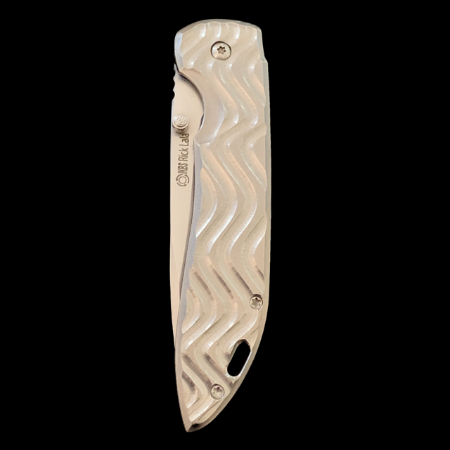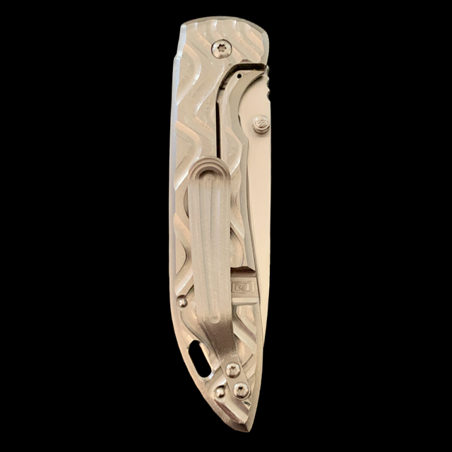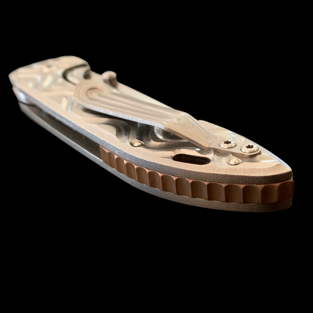 This K2 has a 3.25" satin grind CPM154 blade that is 7.25" overall. The milled titanium frame lock has an orange peel finish throughout. It fires on his IKBS, has a milled copper back spacer, titanium clip and thumb studs. Like New