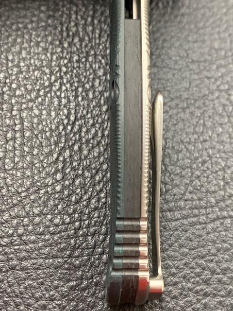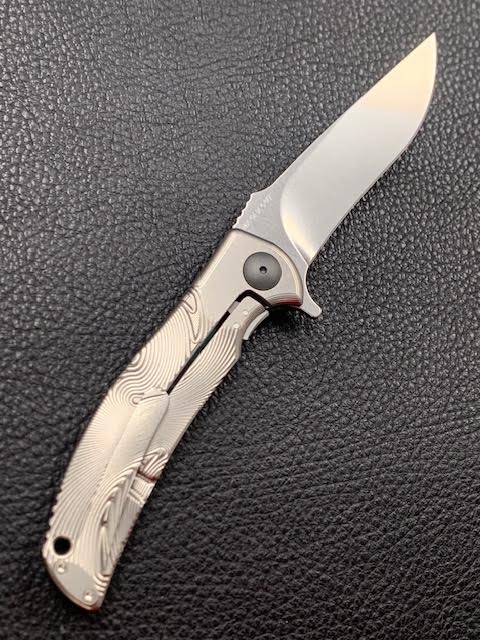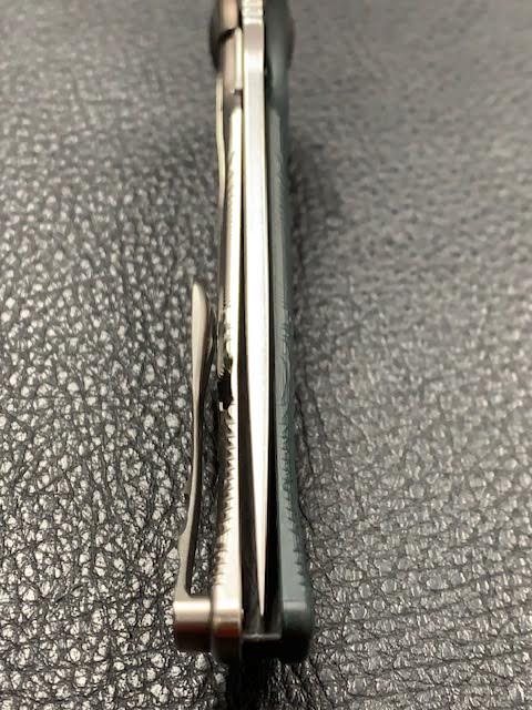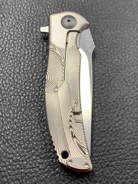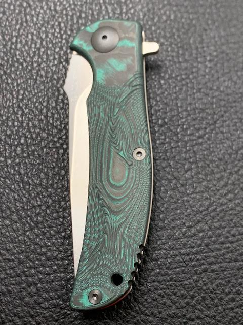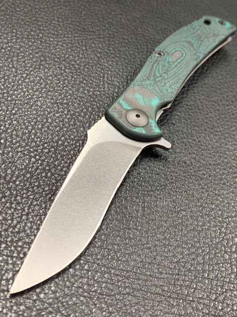 This 1off has a 4" mirrored stonewashed Magnacut blade that is 9" overall. The zirblasted titanium frame lock has a machine pattern on both sides with a Teal CarboTi scale. Fires like a rocket on bearings, has a 3D Titanium clip and carbon fiber back spacer. Very light weight!! New from TKI