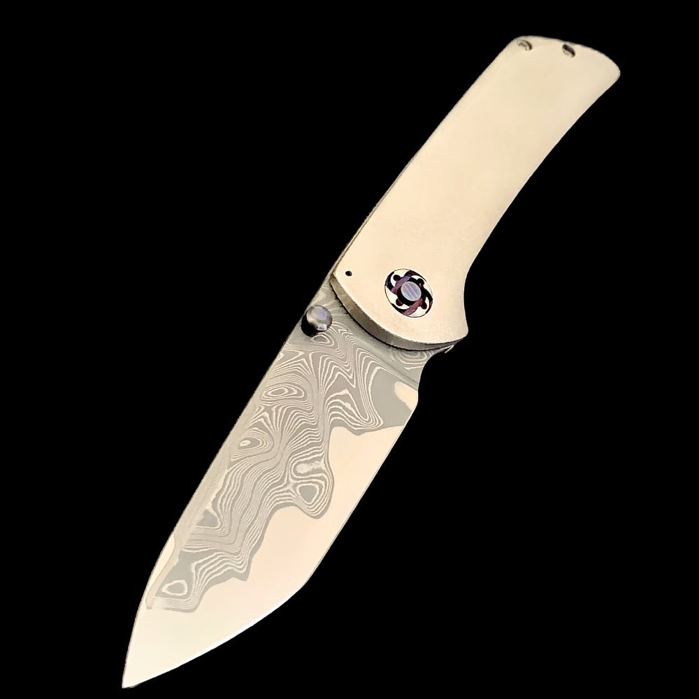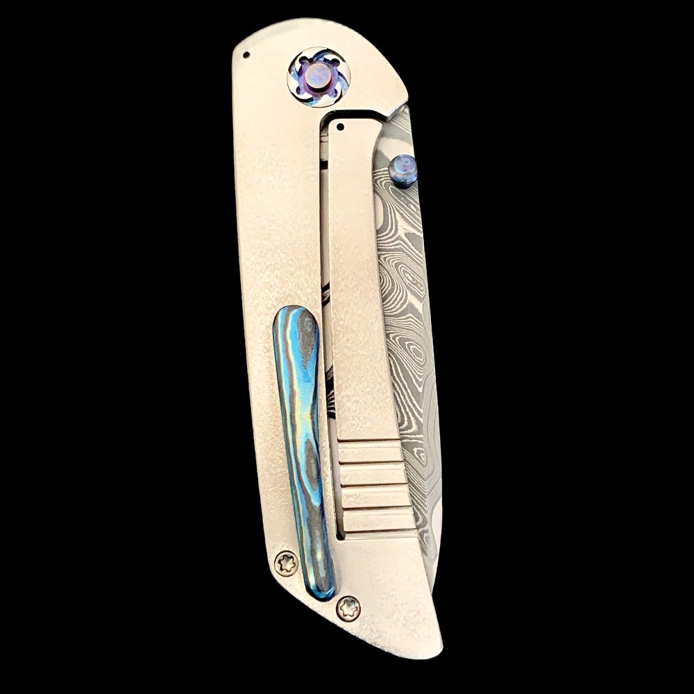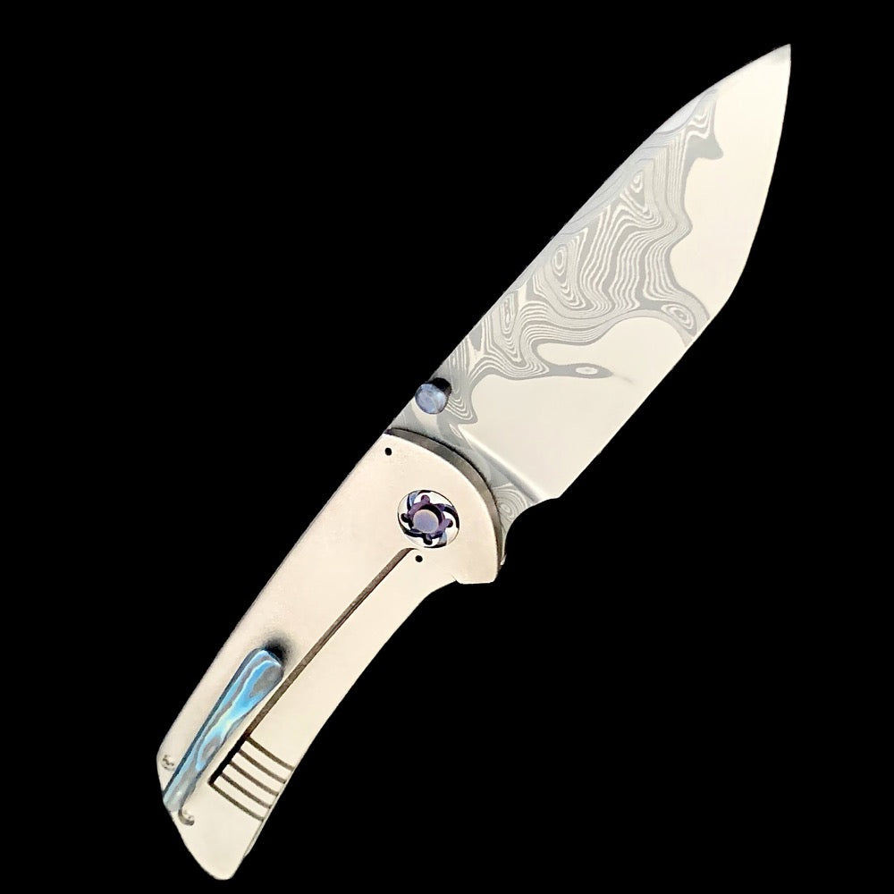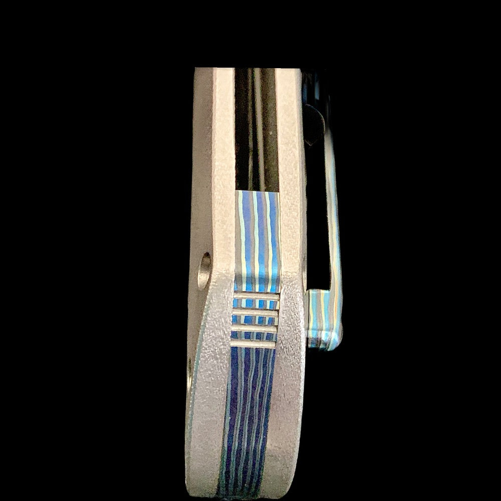 This 1off has a 3" hand rubbed XHP San Mai blade that is 7" overall. This egg shelled titanium frame lock has a light contour finish. Rob hand forge the accents in Timascus(Robtanium) which includes the pivots, thumb studs, 3D clip and back spacer all made by Rob. It fires hard on ceramic bearings and detent with Junkee SS screws. New from Maker! Signed.