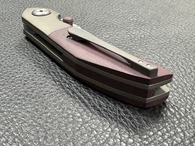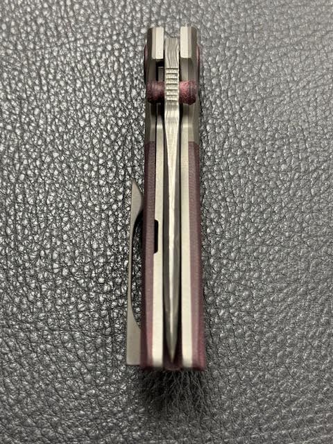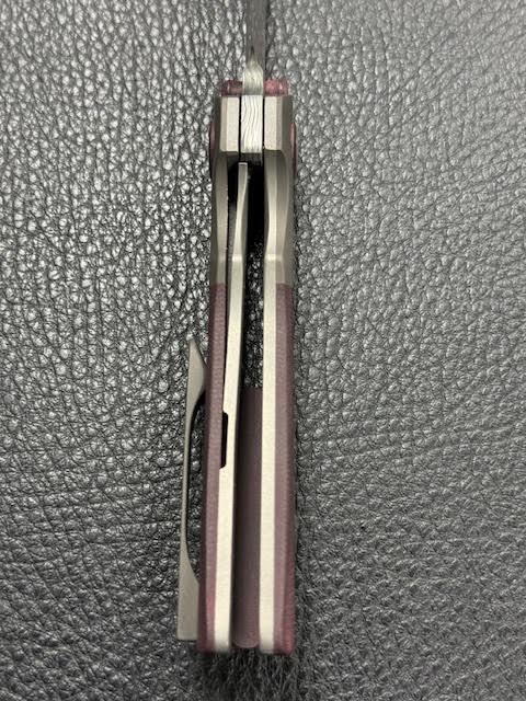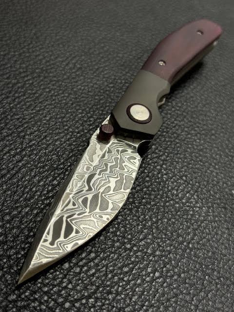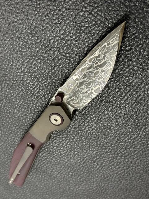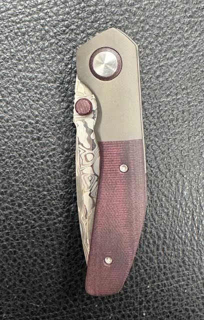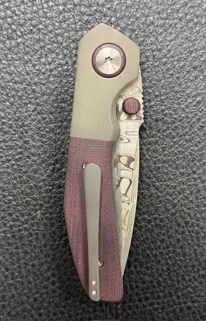 This 1off has a 3.25" Intrepid Damascus blade that is 7.5" overall. The titanium liner lock has titanium bolsters with Burgundy Canvas Micarta scales and accents. Fires on ceramic bearings and has a 3D titanium clip. New from Maker