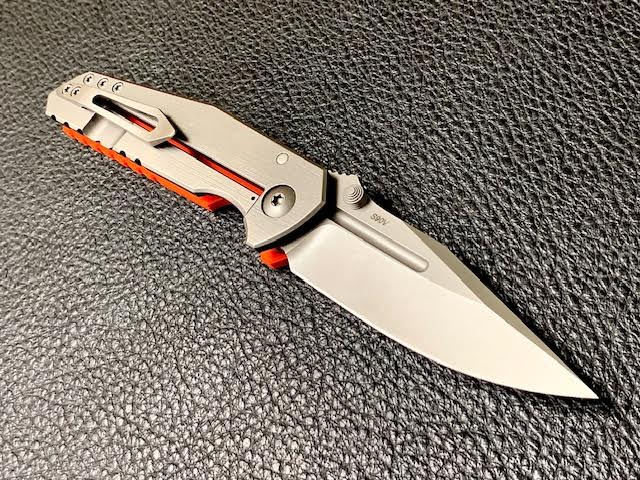 This 1off has a blasted 3" S90V blade that is 7.25" overall. The textured titanium frame lock has a textured orange g10 scale with a white line inlay. Deployes on washers, has titanium standoffs and hardware with a titanium 3D clip. Comes with a case and COA.