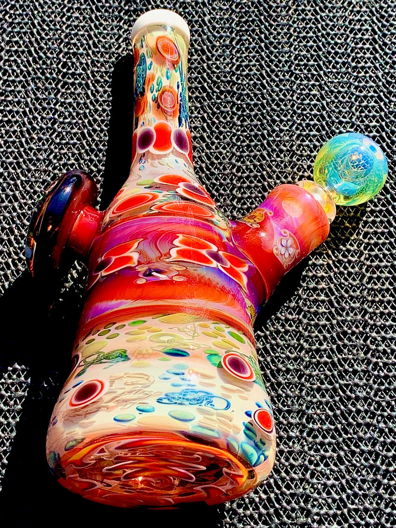 This 1off is 7" overall. Shawn did his Prankster fuming with red sections and montages. Features a heady Tree of Life disk on the back. Signed and changes color.