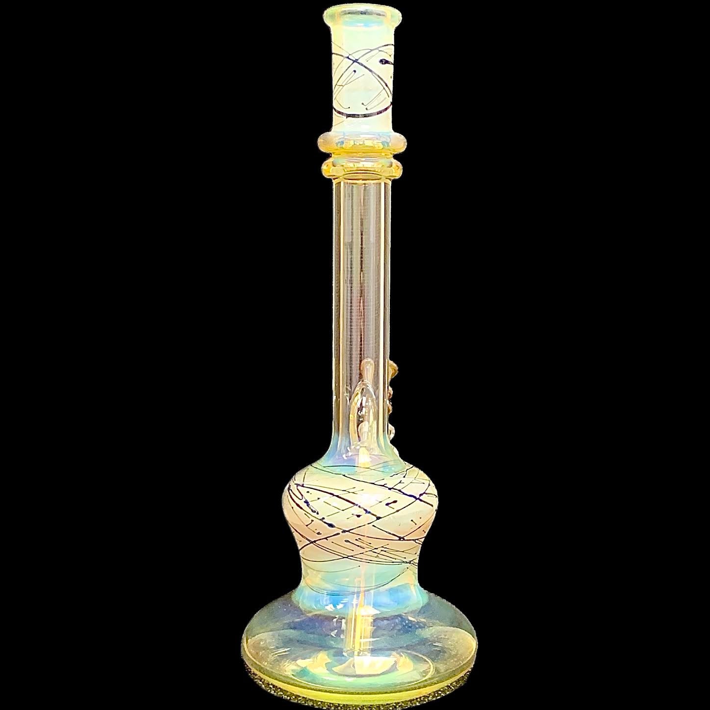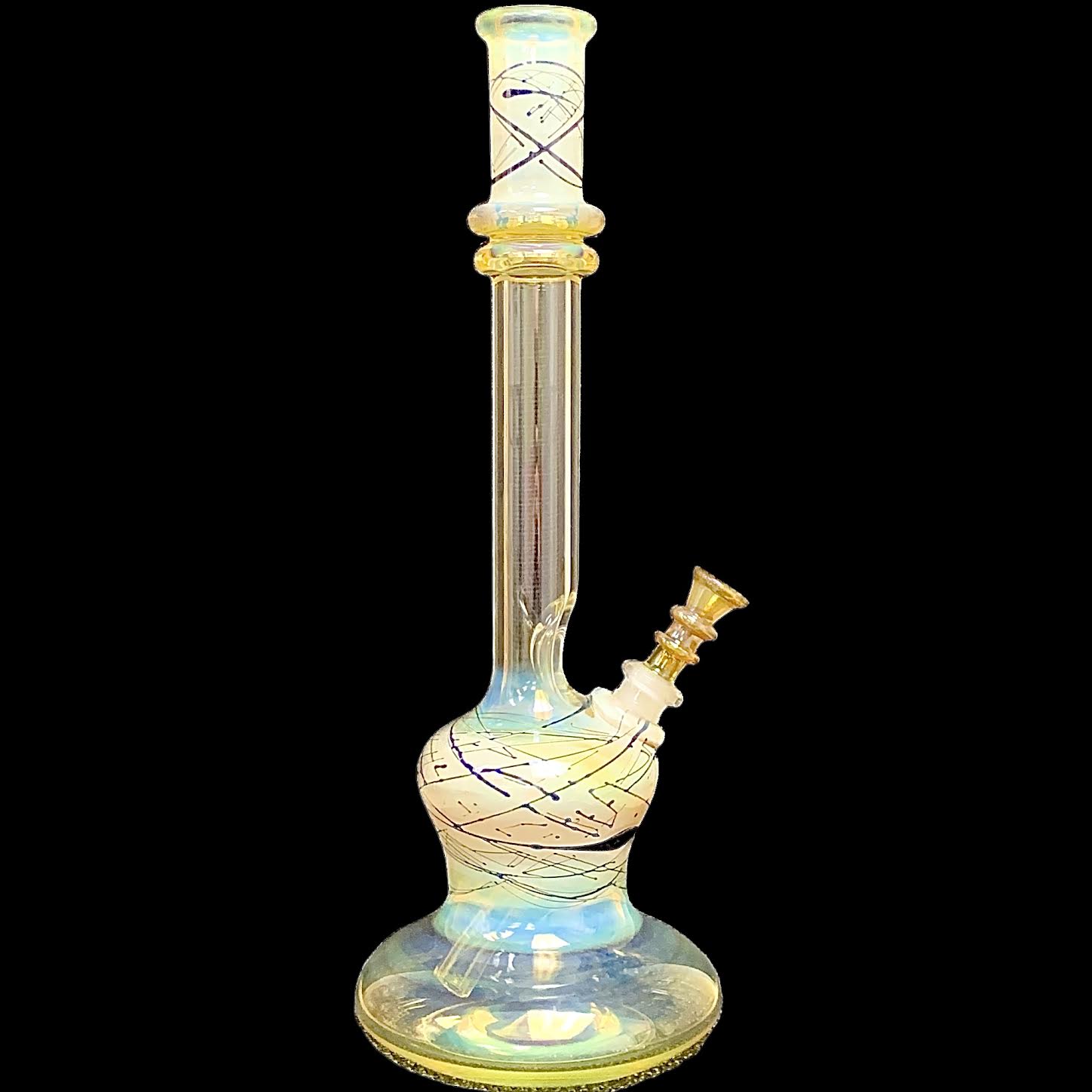 This 1off is 14" overall. Steve did his silver fume with blue on this pancake bong. Features a 14mm slide and open down stem. Changes color when used. Signed! SFG!