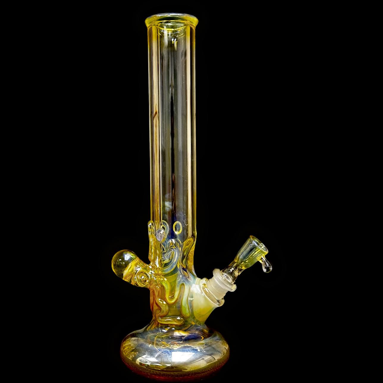 This 40x7 tube is 12” overall. Steve did his fumed OctoSkull on the back that wraps around and has a pancake bottom. It has a 14mm open down stem that comes with a fumed slide and changes color when used. SFG!