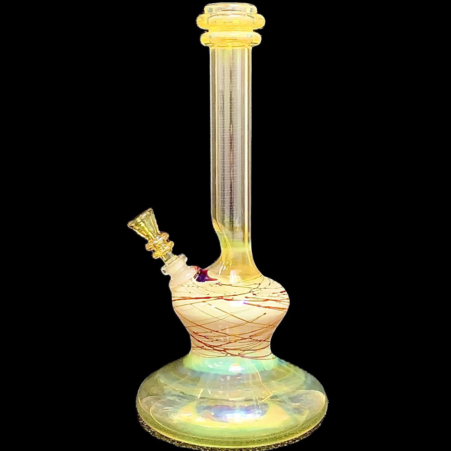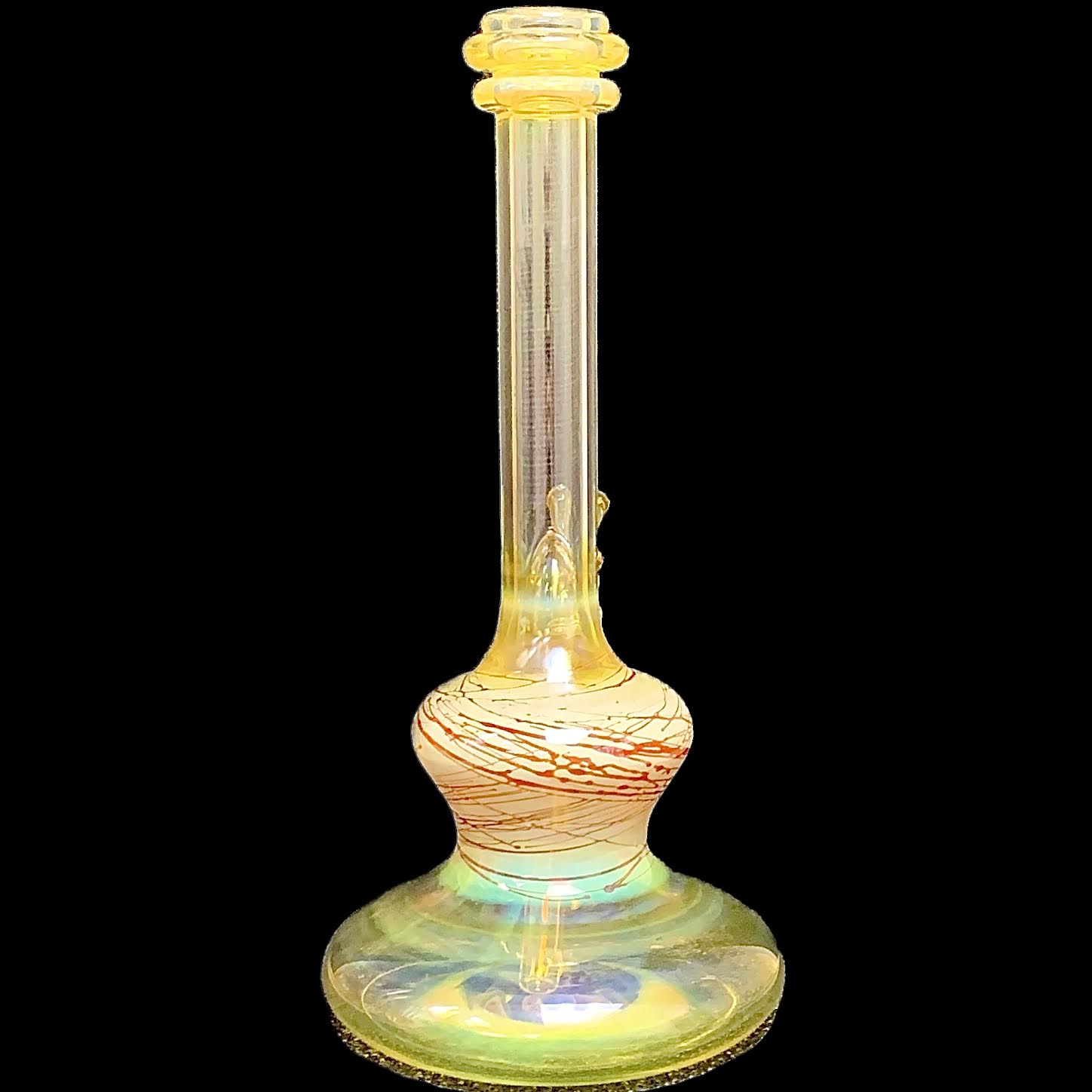 This 1off is 11.5" overall. Steve did his silver fume with red on this pancake bong. Features a 10mm slide and open down stem. Changes color when used. Signed! SFG!