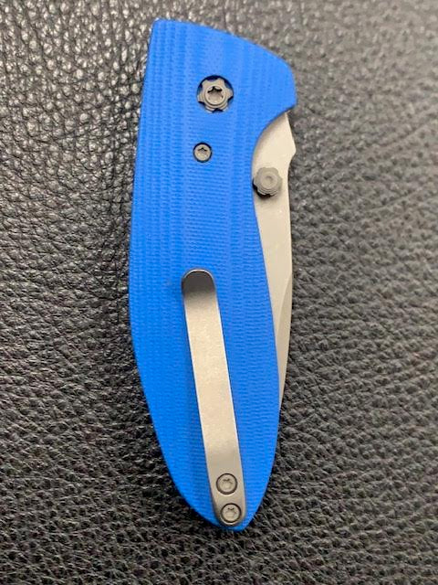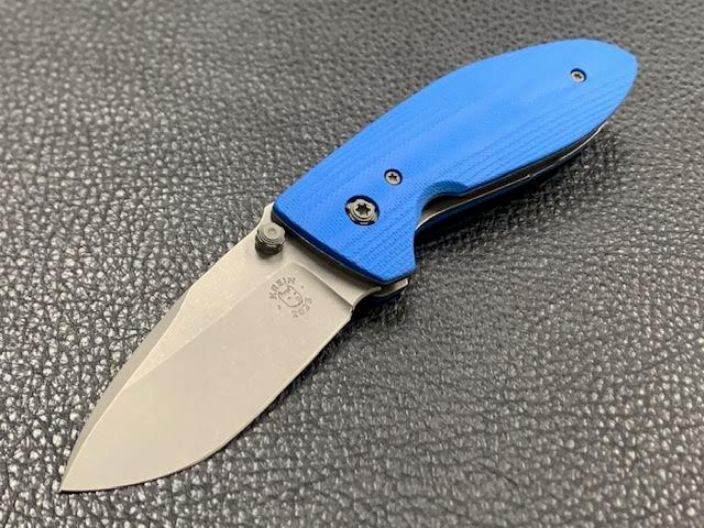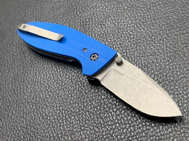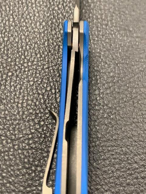 This 1off has a 3" acid washed Nitro-V blade that is 7" overall. Tom did a titanium liner lock wit textured blue g10 scales with titanium hardware. Fires on skiff bearings, has a titanium back spacer and 3D clip. New with COA.