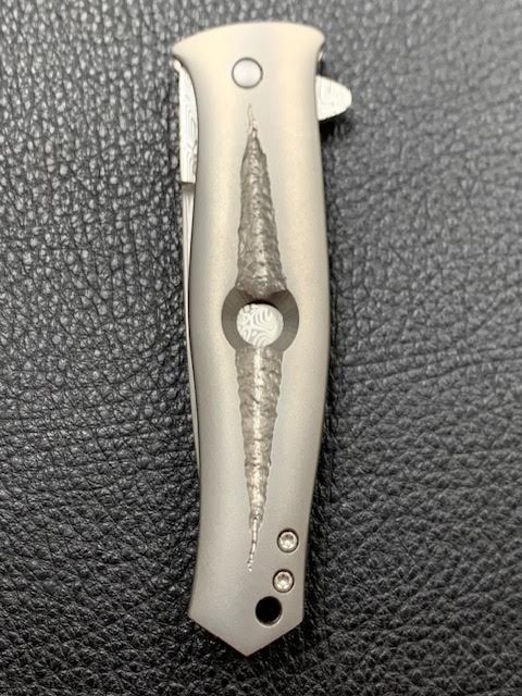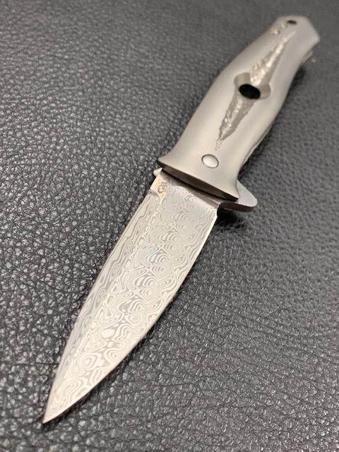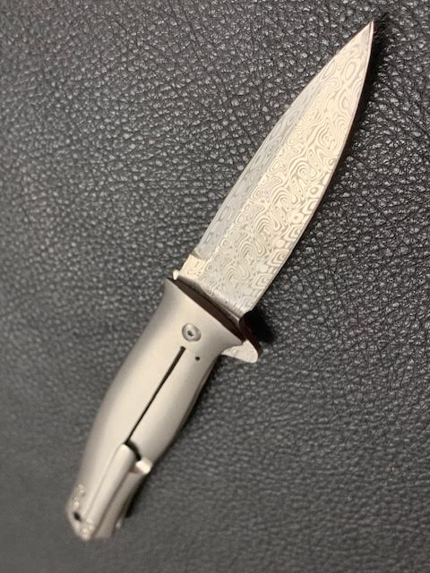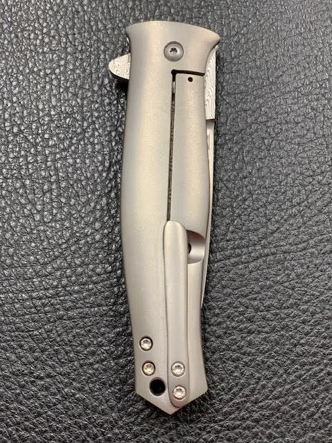 This 1off has a 4" Damasteel blade that is 9" overall. The zirblasted frame lock has a huge crevasse with a speed hole on the show scale. Deploys on bearings, has titanium stand offs and 3D clip. New