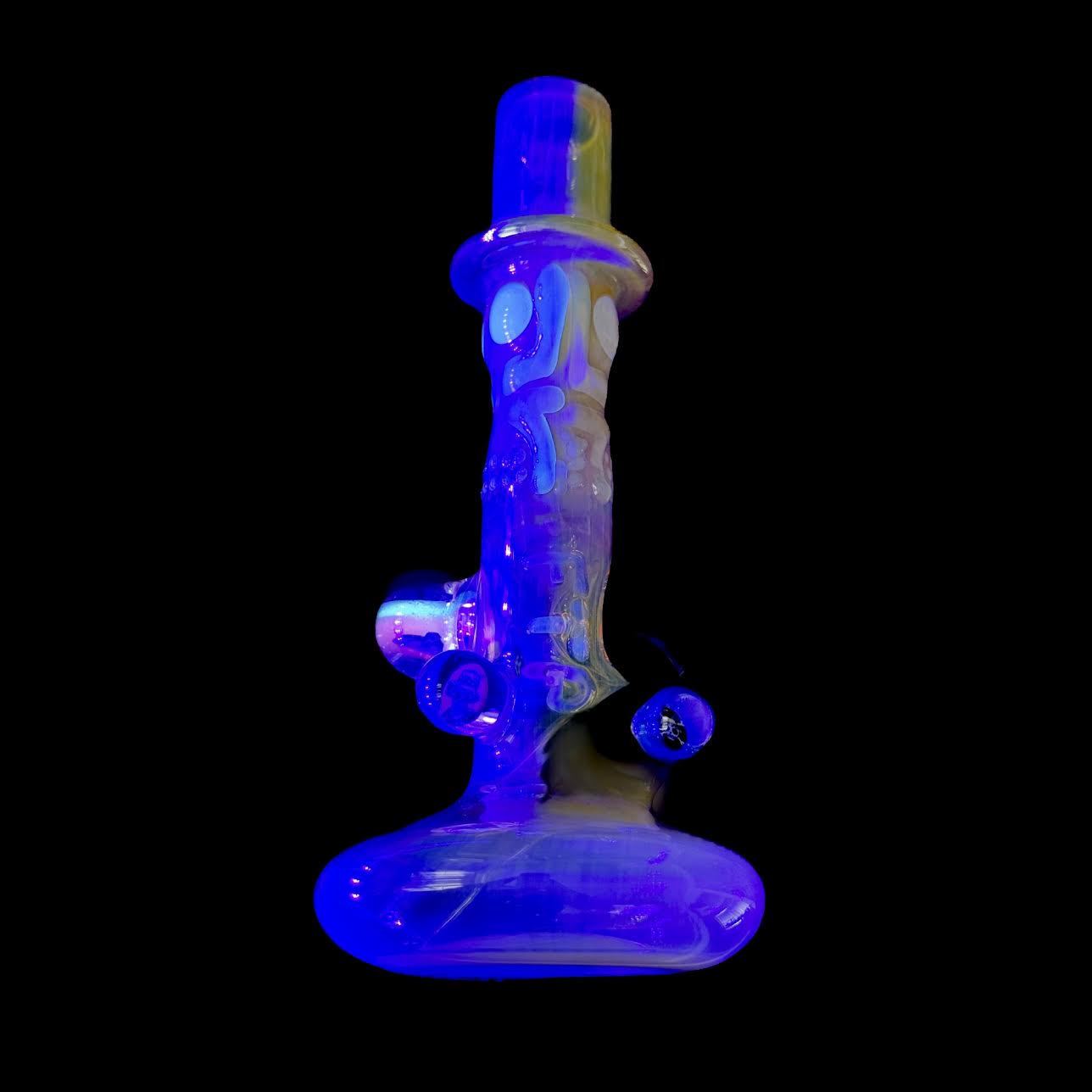 This 1off is 10” overall. Travis did his silver and gold fuming with UV throughout. Features heady millie that light up including the 14mm slide. Changes color when used. Signed & dated. SFG!
