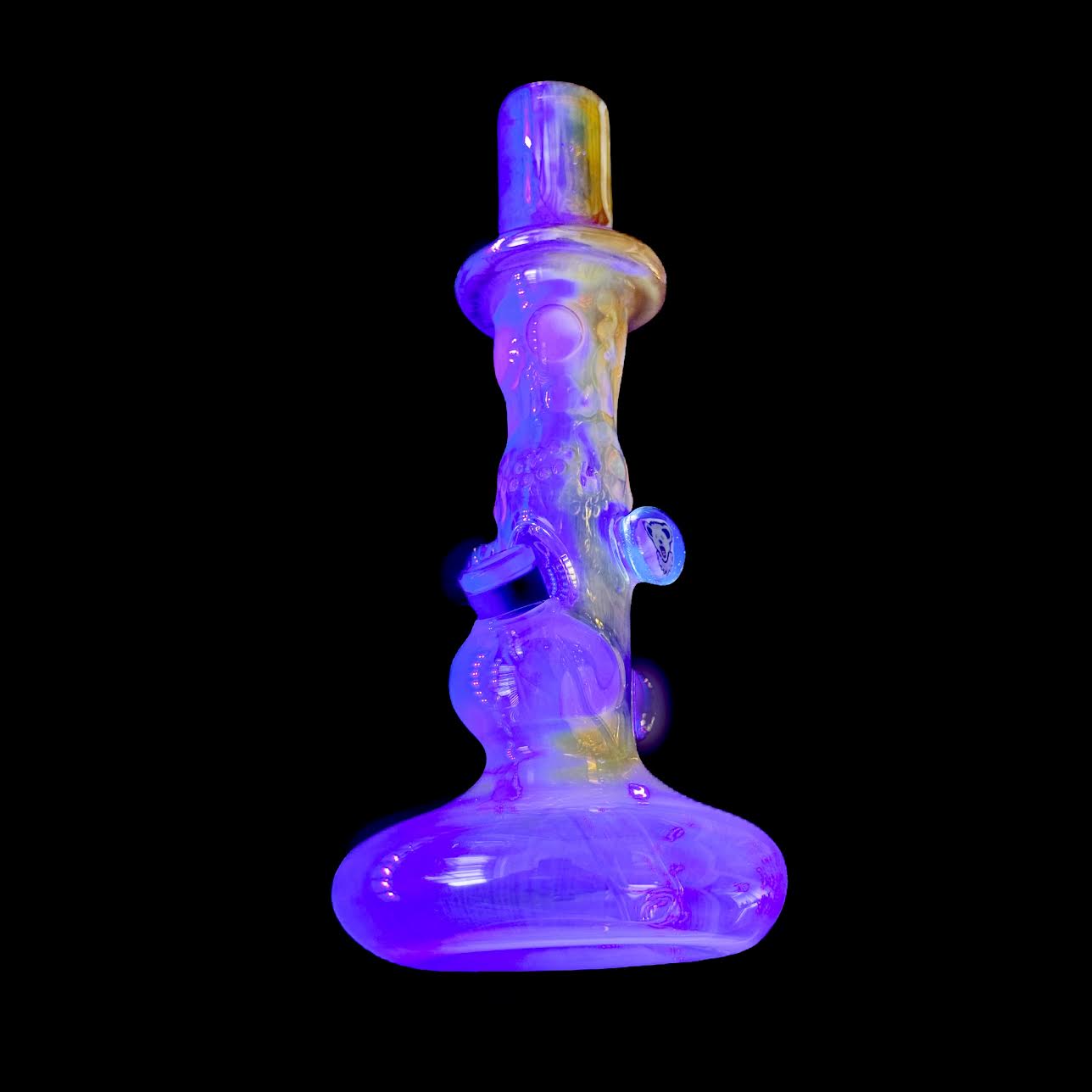 This 1off is 10” overall. Travis did his silver and gold fuming with UV throughout.  Features heady Dead millie that light up including the 14mm slide. Changes color when used. Signed & dated. SFG!