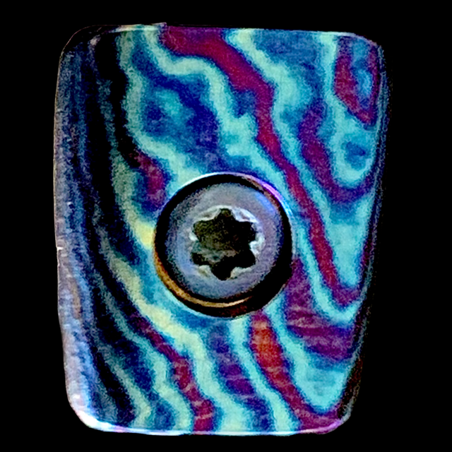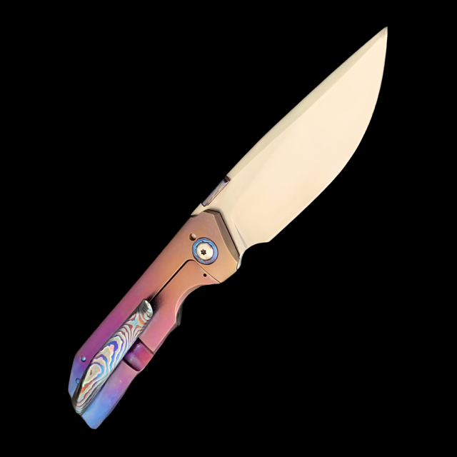 This 1off has a 3.25" hand rub satin Nitro-V blade that is 7.75" overall. Geoff used a piece of vintage Lockheed Martin carbon fiber for the show scale with a colored titanium frame lock. Features Timascus collars, thumb disk with a Zurcuti 3D clip and carbon fiber back spacer. Fires on ceramic detent and bearings. Comes with COA.