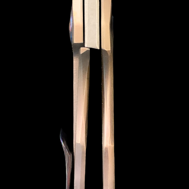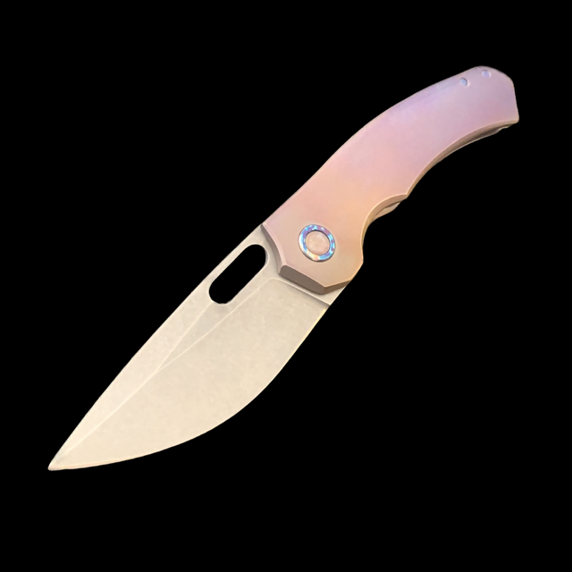 This 1off has a 3" stonewash CPM154 centered blade that is 7" overall. The blue bronze and titanium frame lock has with black Timascus collars and 3D clip. It fires on ceramic bearings and detent with a titanium back spacer. Excellent condition.